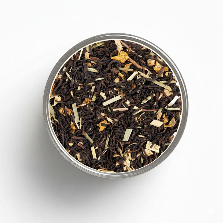 Thé noir Ceylon décaféiné, gingembre (12%), citronnelle, écorces de citron (6%), arôme naturel.