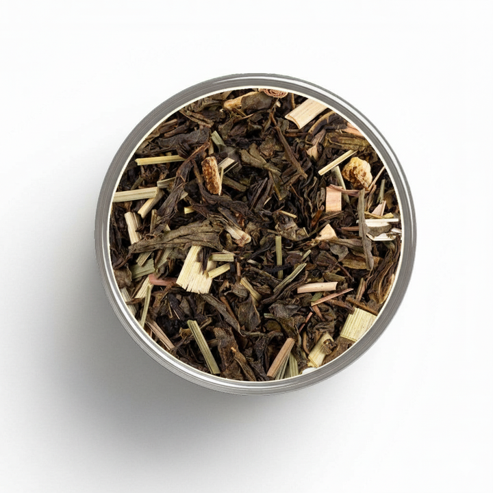 Thé vert China Sencha décaféiné, citronnelle, écorces de citron (12%), arôme naturel.