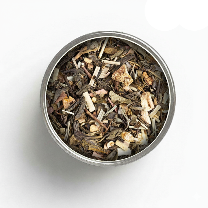 Thé vert China Sencha décaféiné*, citronnelle*, écorces de citron* (12%), gingembre* (8%), Huile Essentielle de Citron* (4%). *Issu de l'agriculture biologique