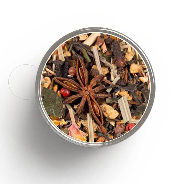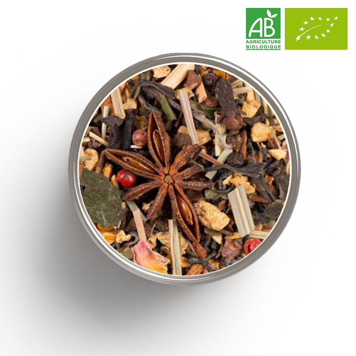 Gingembre*, bâtons de cannelle*, thé vert China Chun Mee*, fève de cacao concassée*, cannelle Ceylan*, anis*, citronnelle*, thé blanc Pai Mu Tan*, poivre noir*, curcuma*, badiane*, poivre rose*, thé blanc Mao Feng*, clou de girofle*, pétales de rose*, cardamome*, chili*, cannelle en poudre*, gingembre moulu*, cardamome moulue*, vanille*. *Issu de l‘agriculture biologique